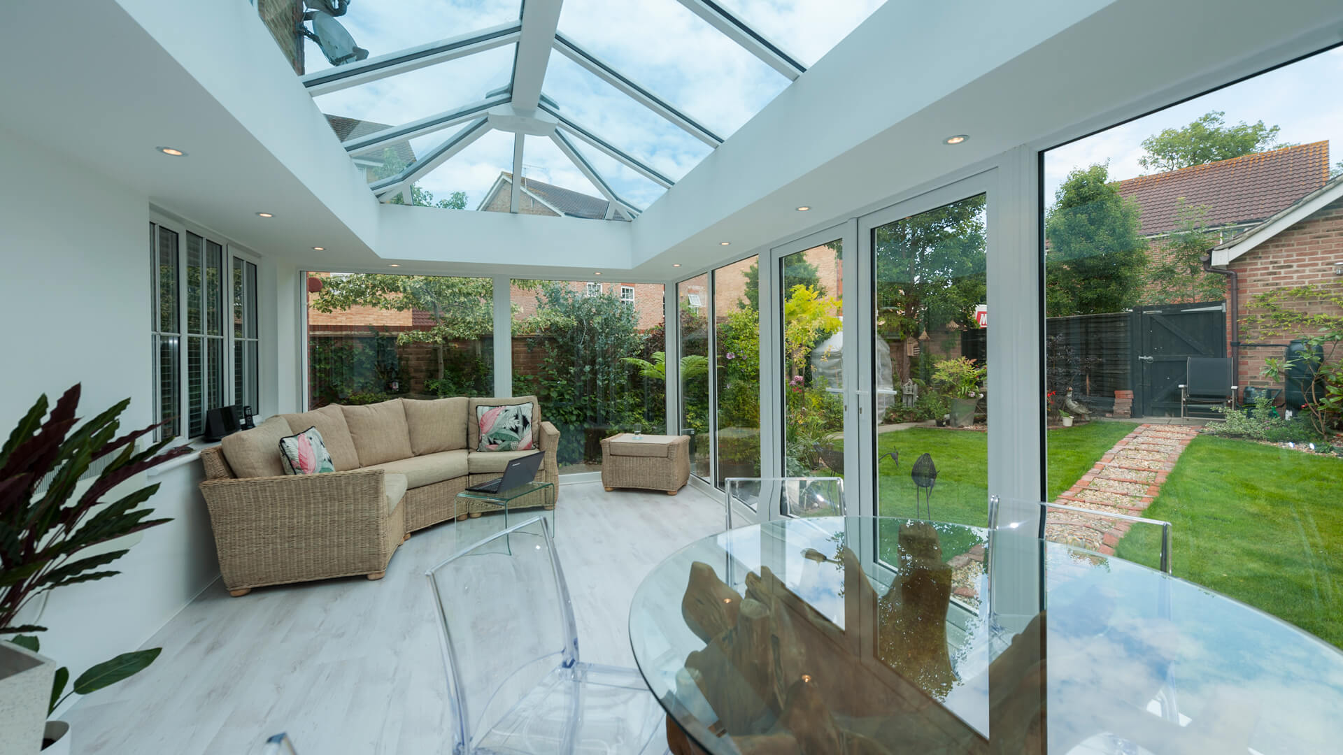 Whether they intend on dining, lounging or working inside the conservatory, the spotlights within the internal perimeter pelmet will enable them to do it long into the night. Due to the dense nature of the perimeter pelmet it made perfect sense to include full-height glass panels so that as much light can travel through the glazing as possible.
