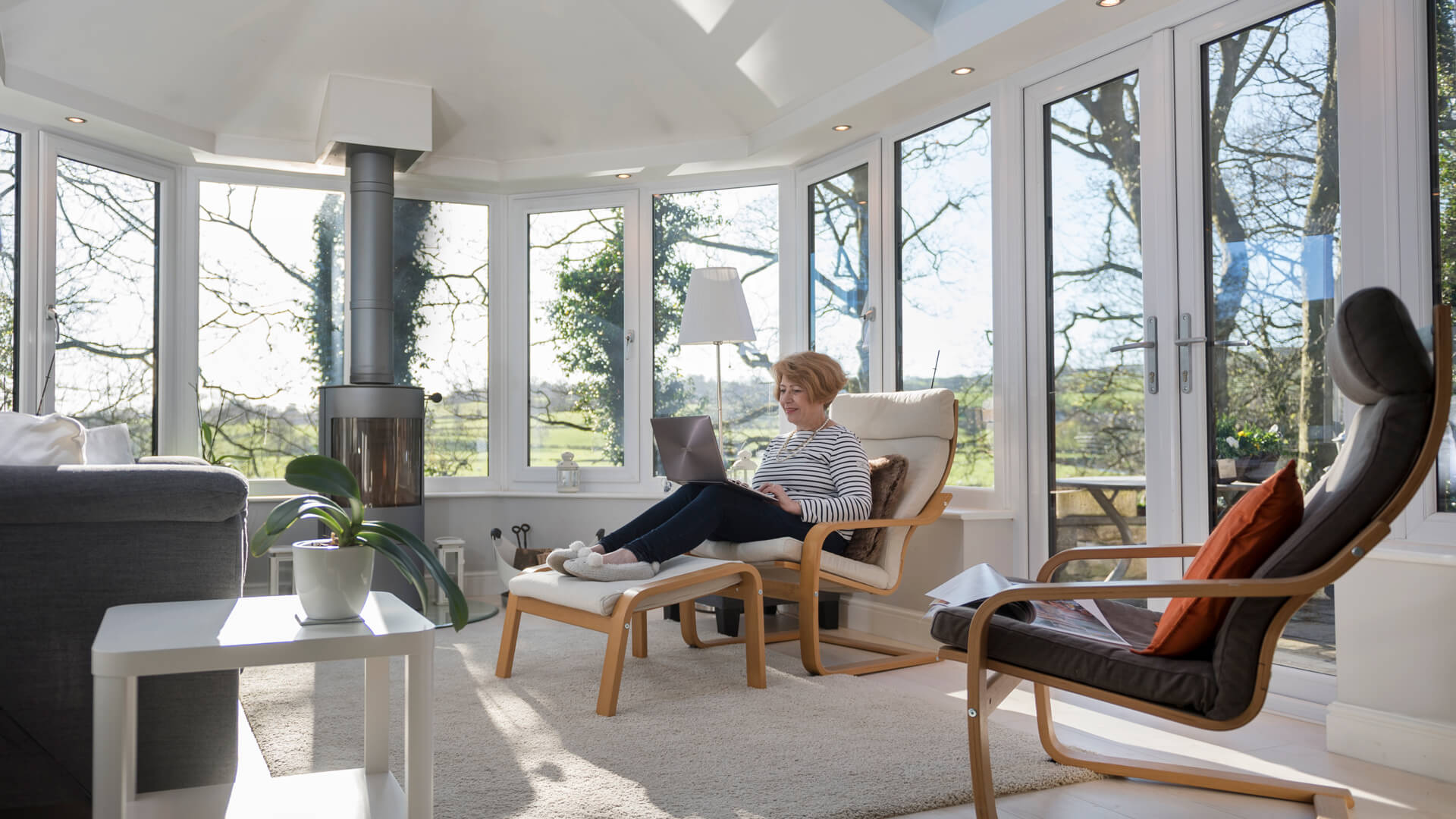 Opting for a Victorian conservatory was a shrewd move on the part of the householders as it complements the architectural styling of the house and looks as though it has been a permanent part of it. Well aware that the Ultraroof will keep the space insulated, they also chose to include a modern fireplace to guarantee themselves extra cosiness in winter.