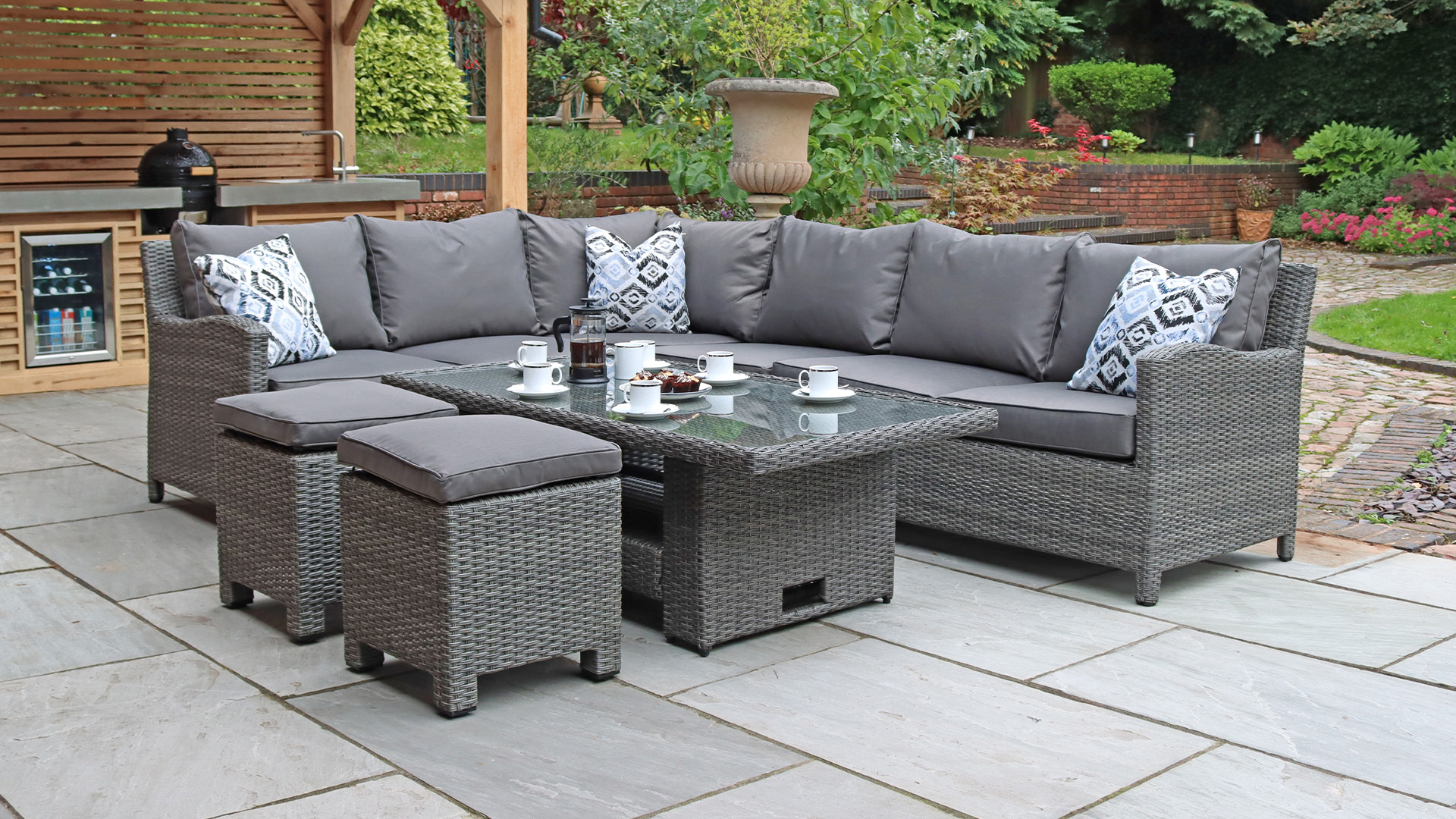 Roma garden furniture 5 seater corner lounge set with coffee table and cushions. For help, advice, a price or anything else about our garden furniture range please call Polly on 01562 60800.